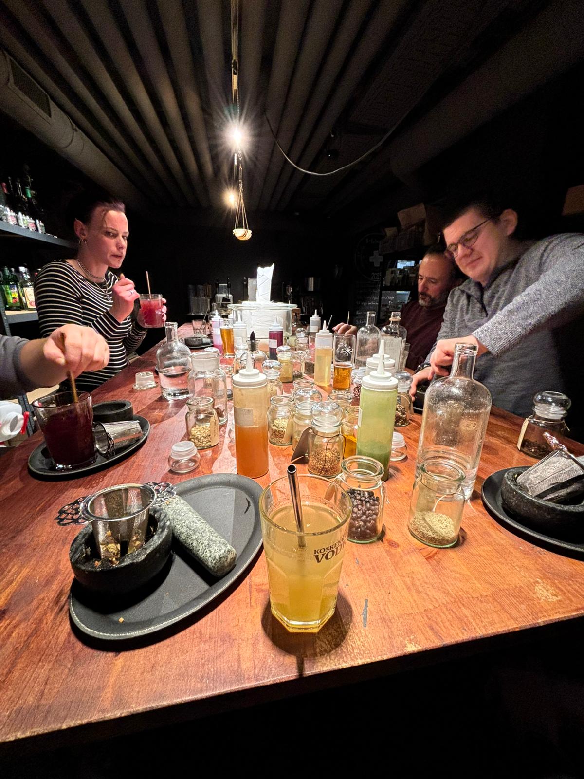 Die eine Gruppe tauchte beim Alchemist in die Welt der Cocktails ein. Unter Anleitung durften sie ihre eigenen Drinks mixen und kreierten sogar einen Zweipack-Gin. Natürlich durfte zwischendurch auch degustiert werden.