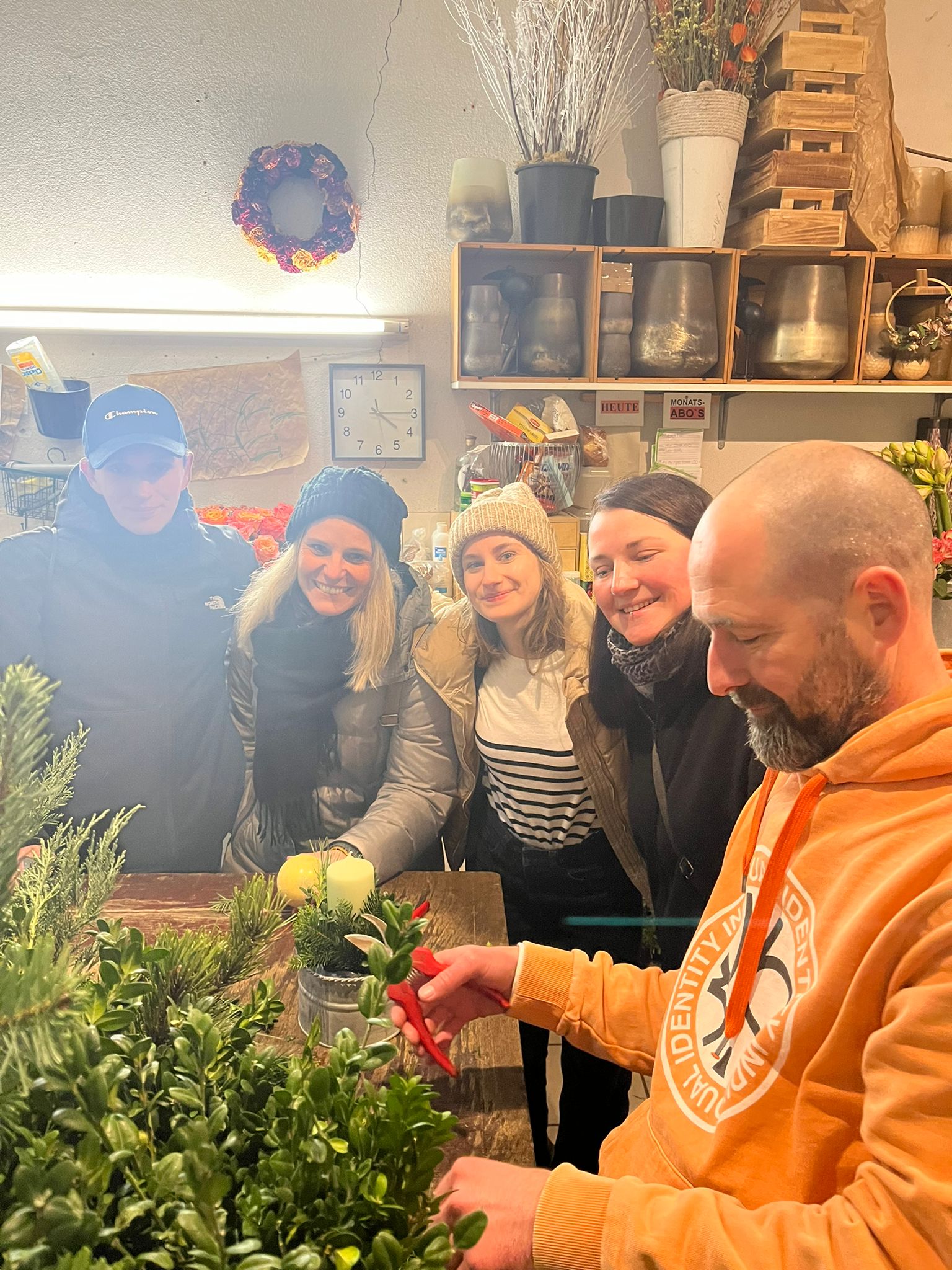 In diesem Jahr sind wir im Magazin gestartet, wo uns Carmen in Ihren extra für Zweipack erstellten Postenlauf eingeführt hat. In drei Gruppen mussten wir uns den schwierigsten Aufgaben stellen: Von Eisskulpturen schnitzen, über Weihnachtslieder per Sprachnachricht versenden, Kugeln am Weihnachtsbaum zählen bis hin zu "Rätseln unter Glühweineinfluss" war alles dabei. Sogar einen Adventskranz durften wir selber binden (natürlich unter Anleitung der Inhaberin des "Bluemehuus Bäumleingasse 7").