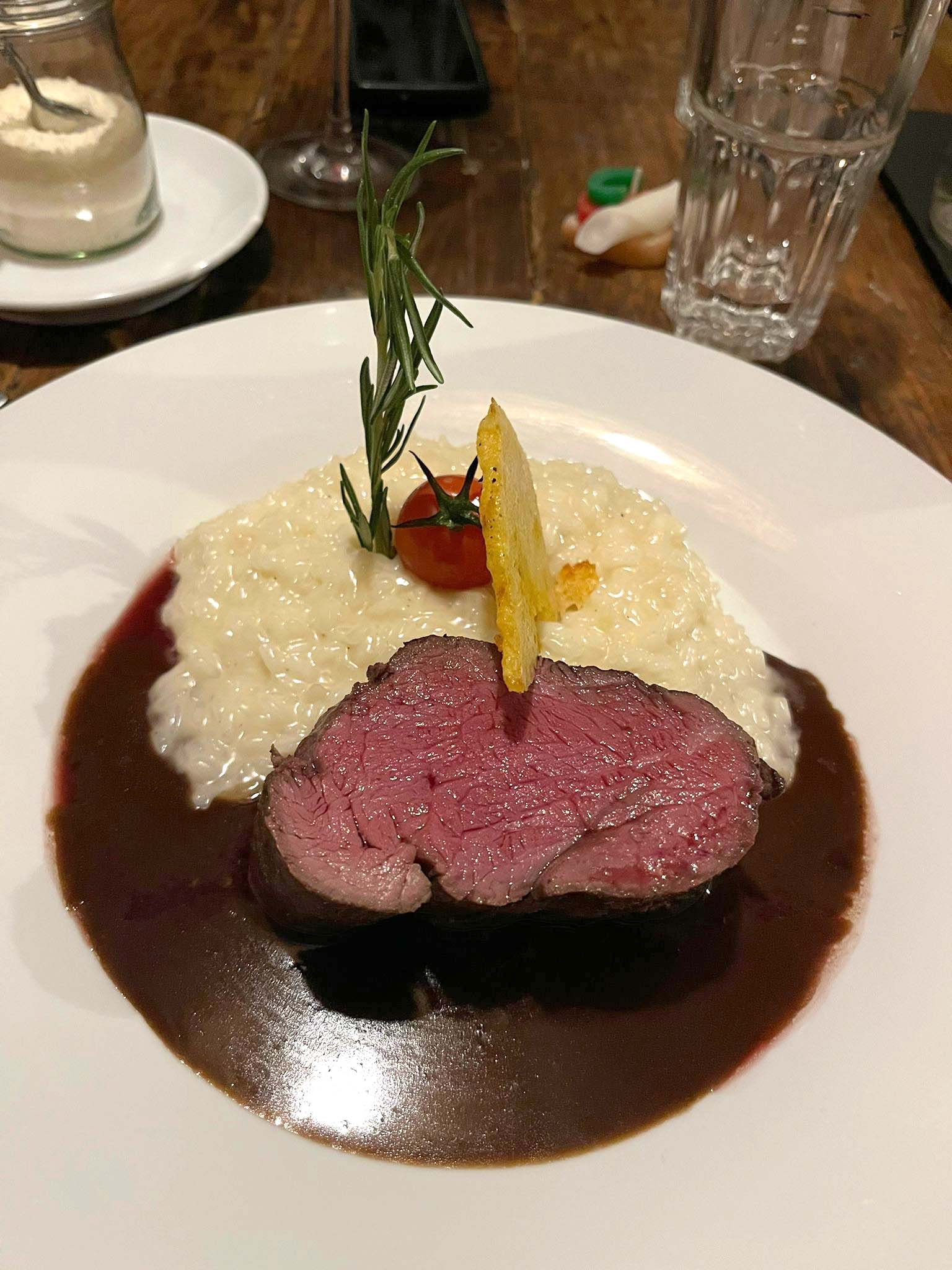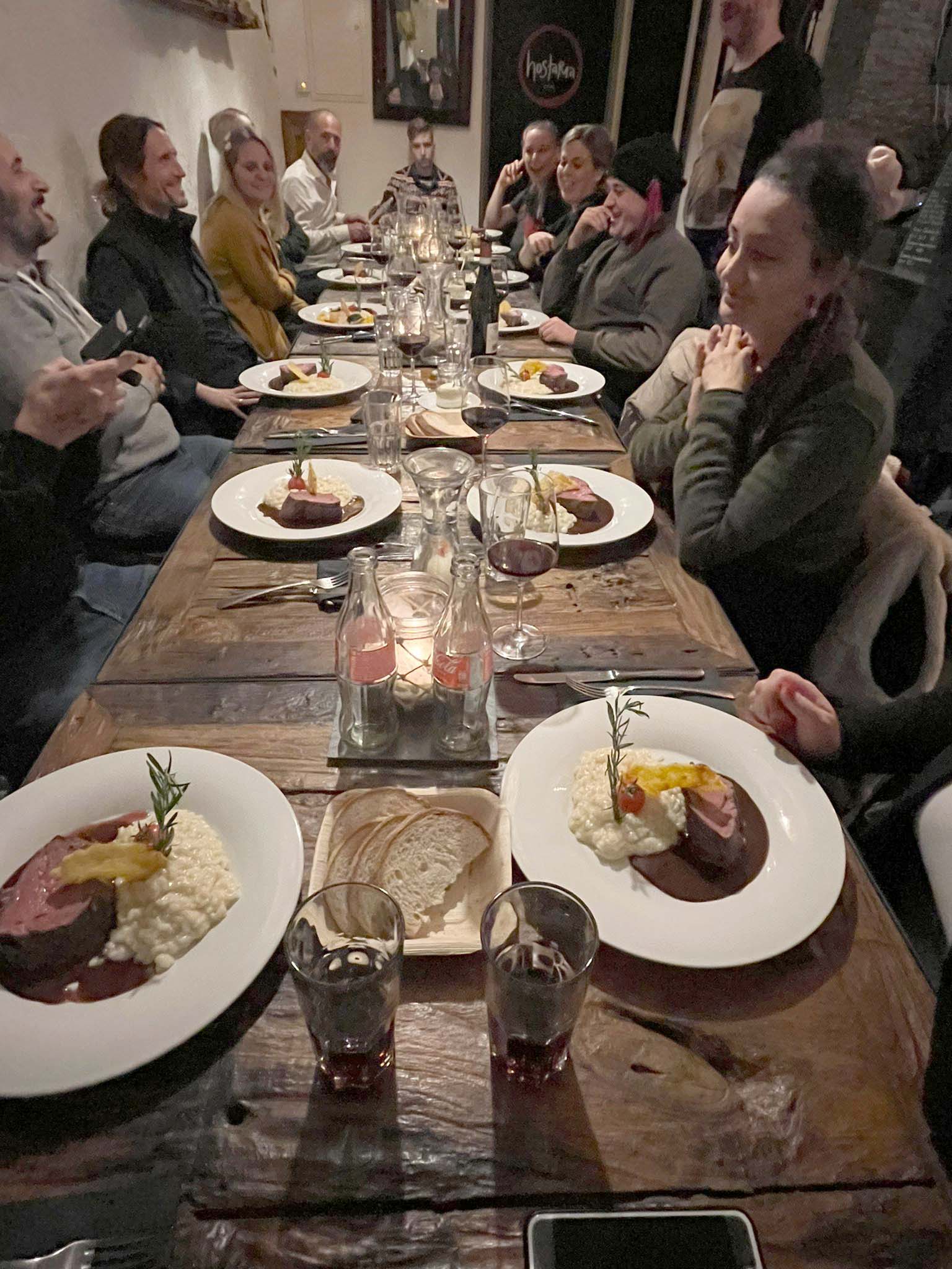Der Postenlauf endete im «Kafka am Strand», wo wir geschwächt und vom Wetter unterkühlt, beim Aperó unsere Energiereserven aufladen konnten. Im Anschluss haben uns Gianni und Sven in der Hosteria ein köstliches Rinderfilet mit sämigem Risotto serviert. Es wurden Reden geschwungen und Weingläser geleert.