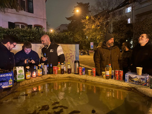 Der Abend begann entspannt mit einem Apero am Spalentorbrunnen (danke André!). Bei gutem Wein und Bier stimmten wir uns auf den bevorstehenden Abend ein. Nach der ersten Runde (und dem ersten Anstossen) zog es uns natürlich direkt zum Chäsbängel-Stand, wo wir uns ordentlich dem Fondue hingaben – reichlich Käse, Brot und natürlich ein paar Gläser Wein, damit wir nicht zu „Käse-Schnarchnasen“ wurden.